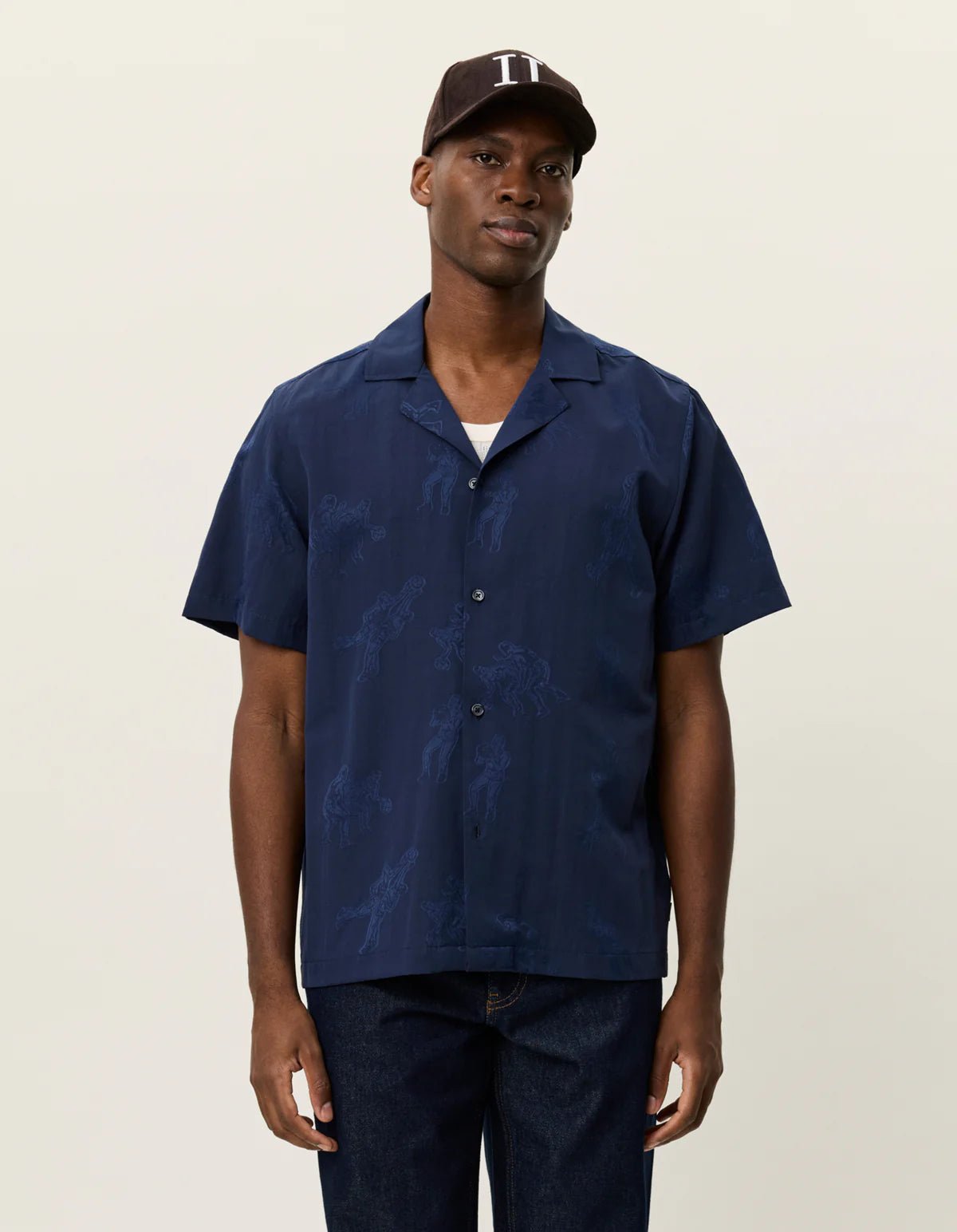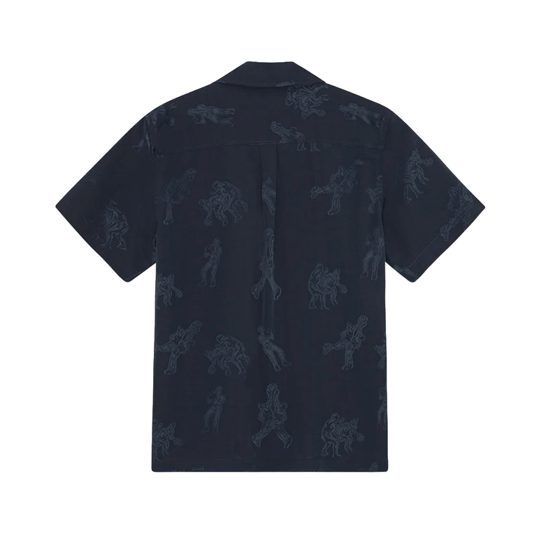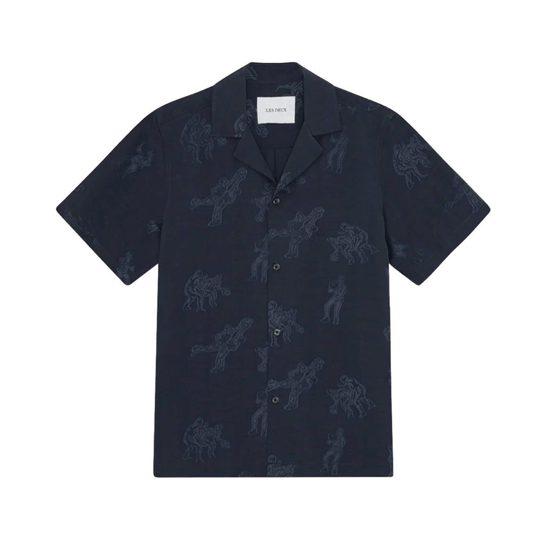 La Lesley Players Jacquard SS Shirt – Dark Navy allie fluidité estivale et détails graphiques raffinés. Confectionnée dans un jacquard léger en mélange lyocell et polyester, cette chemise à coupe ample séduit par son motif tissé intégral représentant des joueurs de basket. Son col cubain et son ourlet droit accentuent une silhouette décontractée, parfaite pour les journées ensoleillées où le style ne fait aucun compromis avec le confort.