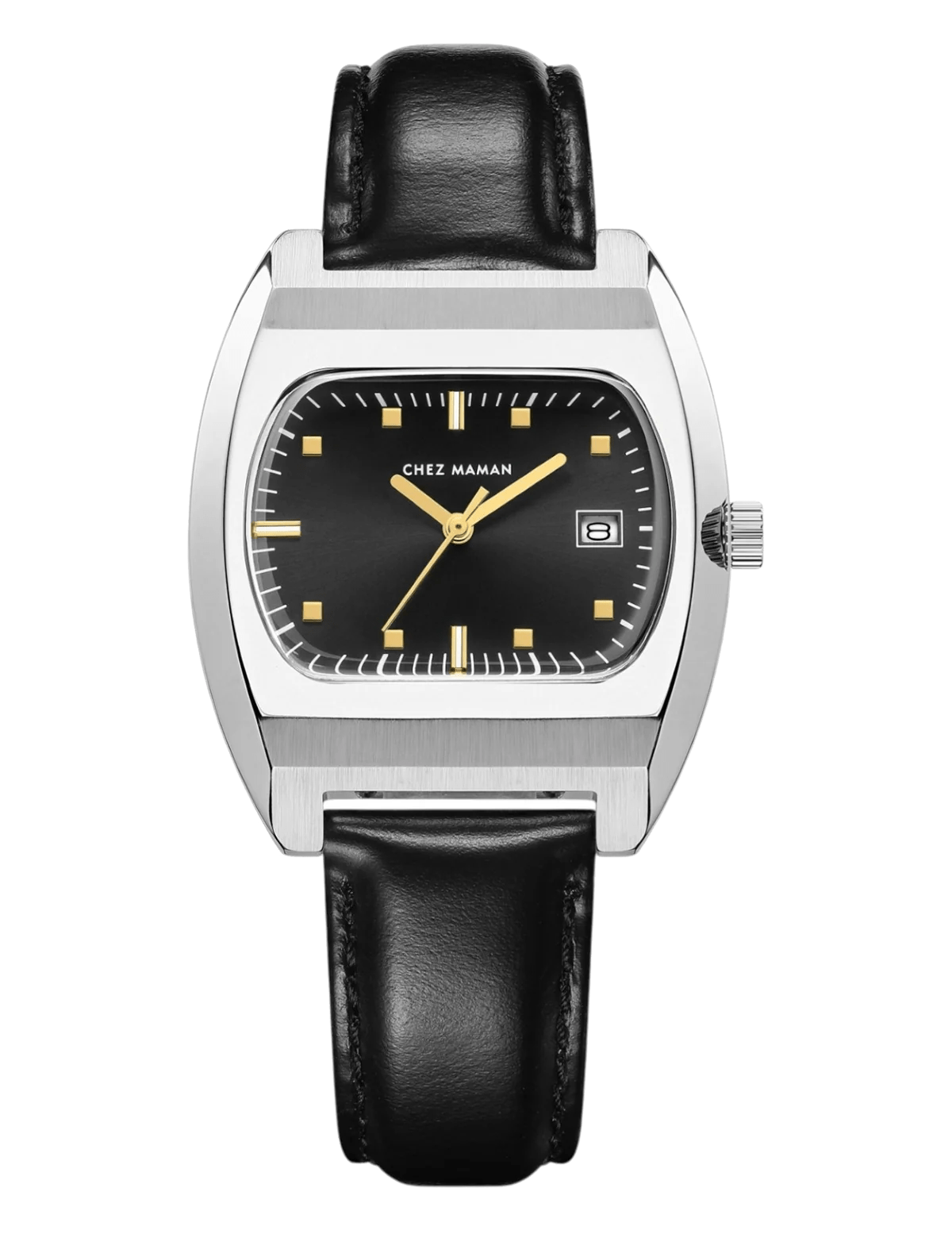 Avec son design graphique et minimaliste, la Magnum Black Sand s’impose par son cadran noir mat, subtilement contrasté par un boîtier coussin en acier brossé de 35 mm. Elle incarne une esthétique rétro sans détour, où chaque détail — des index dorés à la date à 3 heures — affirme un style à la fois radical et équilibré. Son mouvement quartz japonais Miyota garantit précision et fiabilité au quotidien. Une montre unisexe, sobre et percutante.