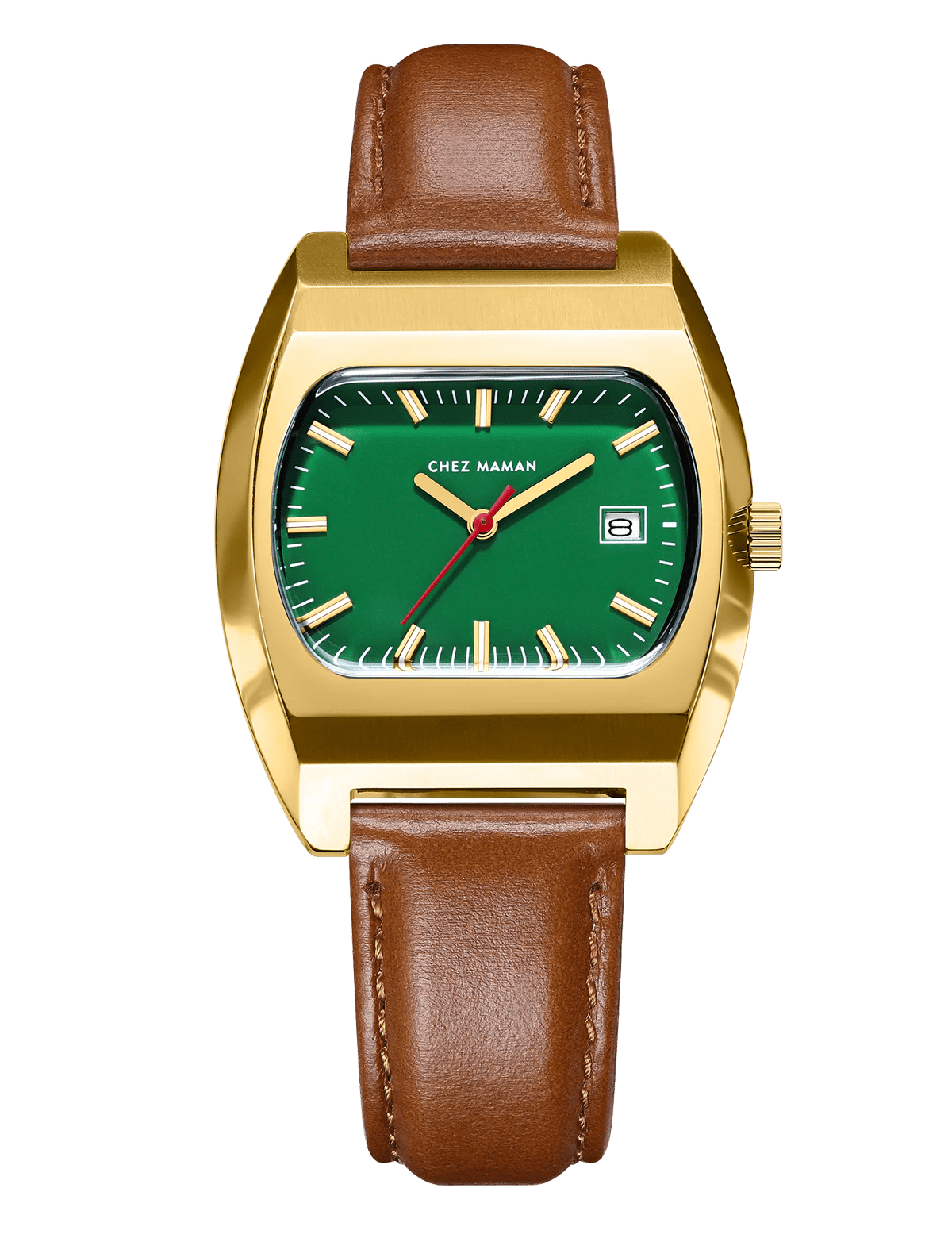 Avec son cadran vert basilic vibrant et son boîtier doré mat au style rétro, la Magnum Gold Basil Green impose une élégance audacieuse. Son format coussin de 35 mm, ses finis brossés et polis, et sa trotteuse rouge vif lui confèrent un caractère unique, tout en finesse. Fiable grâce à son mouvement quartz japonais Miyota, elle marie palette vintage et design contemporain avec maîtrise. Une montre unisexe, pensée pour ceux qui aiment affirmer leur style avec subtilité.