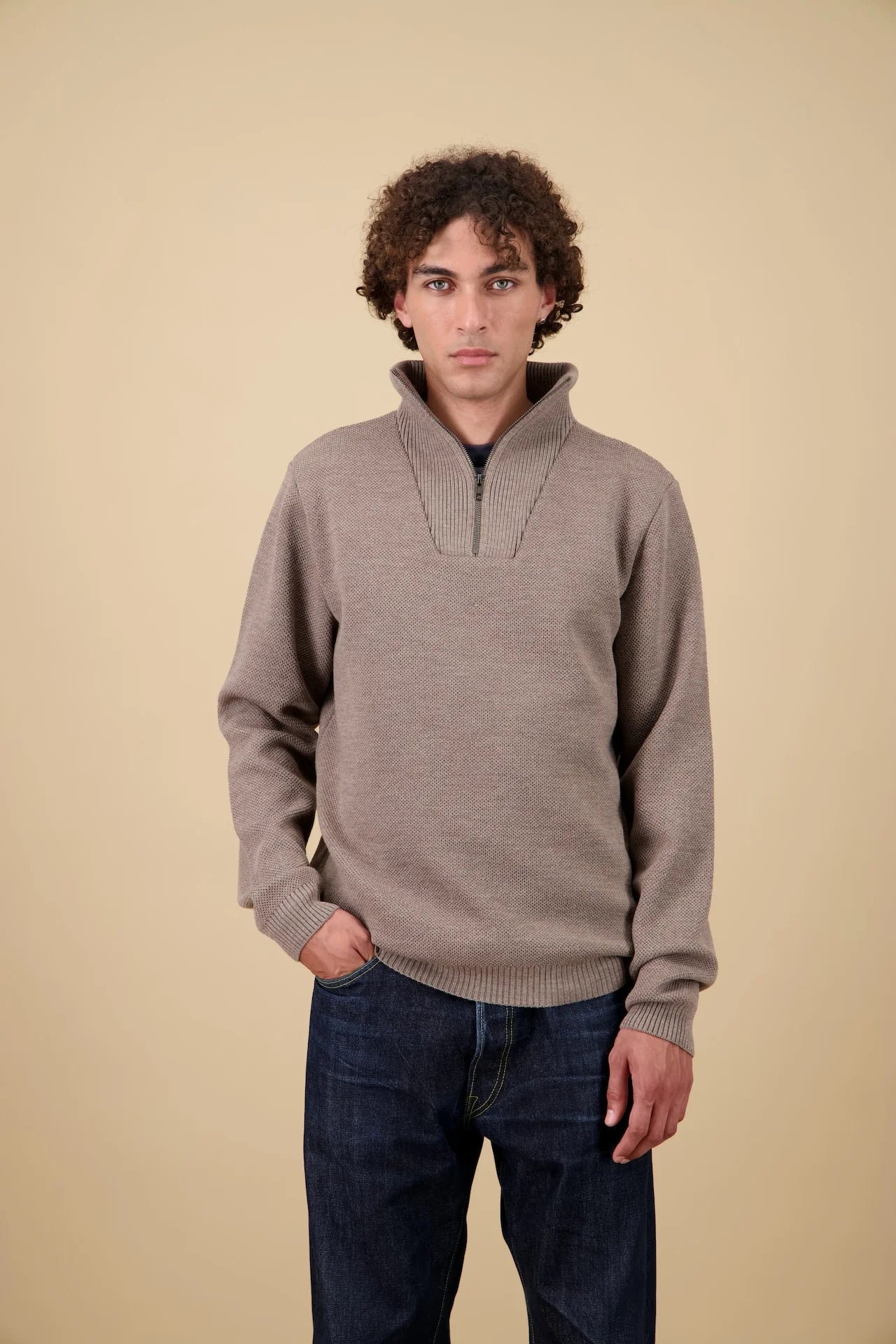 Le Pull Youri Camionneur - Taupe réinvente une pièce iconique du vestiaire ouvrier avec une élégance moderne et fonctionnelle. Son col montant zippé YKK Excella – discret et fluide – vous protège sans jamais gêner, même au contact direct. Tricoté en laine mérinos extra-fine, il offre un touché doux et une structure nette grâce à sa maille piquée serrée. Avec 1 cm d’aisance supplémentaire aux épaules, ce modèle assure un confort optimal, sans compromettre la coupe ajustée.
